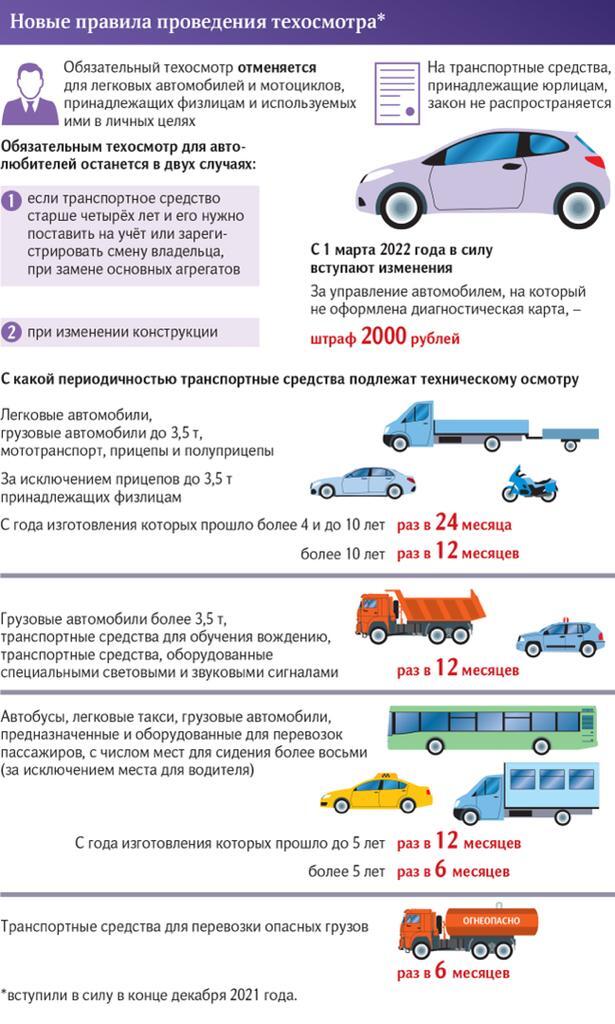 С 1 марта 2022 года заработал штраф в 2000 руб. за езду без техосмотра. Фиксировать нарушение раз в сутки смогут дорожные камеры. Однако, как уточнил спикер Госдумы Вячеслав Володин, штрафовать за езду без диагностической карты будут владельцев только тех транспортных средств, для которых техосмотр останется обязательным. На всех остальных штраф распространяться не должен.